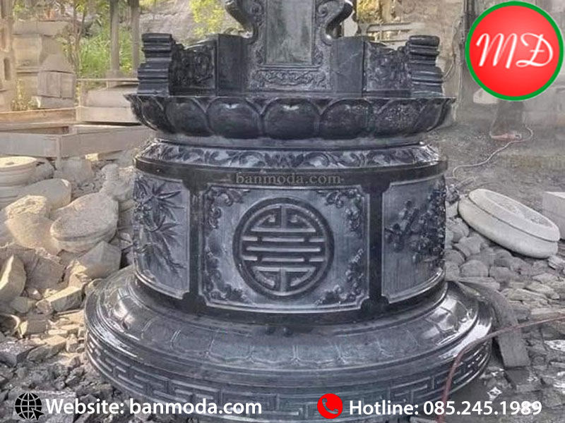 Mộ đá tròn xanh đen chạm tứ quý thường có kích thước chuẩn từ 90cm đến 130cm đường kính, chiều cao tổng thể từ 1m đến 1,5m, phù hợp với nhiều không gian lăng mộ khác nhau. Mỗi phần như đế, thân, nắp và bia đá được chế tác theo tỷ lệ hài hòa, đảm bảo tính thẩm mỹ và vững chắc. Kích thước có thể tùy chỉnh theo yêu cầu của gia đình, đáp ứng tốt cả nhu cầu phong thủy và sự thuận tiện khi vận chuyển, lắp đặt. Đây là lựa chọn lý tưởng cho thiết kế lăng mộ tinh gọn, sang trọng và dễ dàng bố trí trong quần thể đá mỹ nghệ.